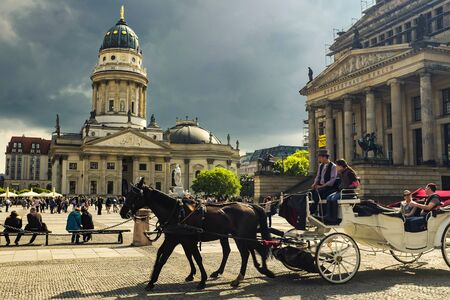 View on German Cathedral and Konzerthaus on Gendarmenmarkt in Berlin, Germany. May 2014 The carriage drives tourists around the square.