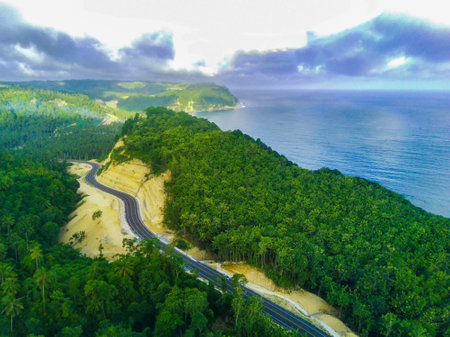 Aerial view coastline on tropical island Camiguin with road, sea, trees and palms.Road along the coast. Amazingly beautiful landscape of nature with hills, rain forest. Seascape: Ocean. Philippines.Travel concept.