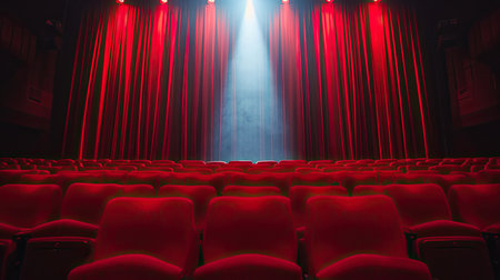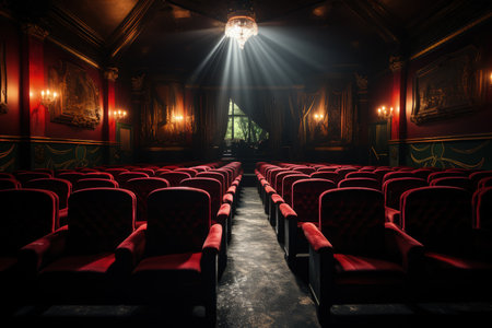 Captivating theater interior showcasing red seats facing a lit stage, creating a dramatic ambiance ideal for performances and events, blending elegance with vintage charm.
