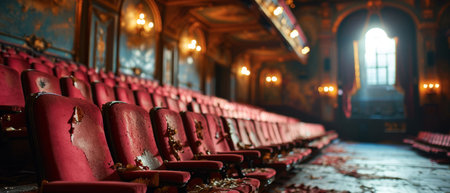 Captured view of an empty theater showcasing rows of red chairs under dramatic lighting, highlighting the classic architecture and creating a serene atmosphere.