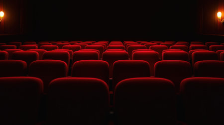 Rows of empty, plush red seats in a dark theater create a sense of anticipation for the upcoming film.