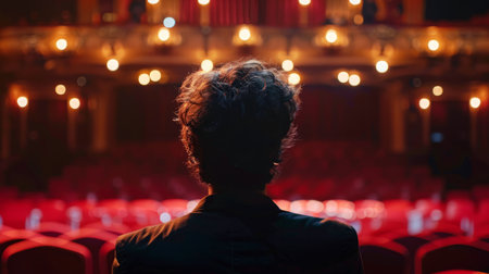 A lone figure stands in a historic theater, surrounded by warm, glowing lights hanging from the ceiling. The audience seats are empty, emphasizing the quiet ambiance as the night unfolds.