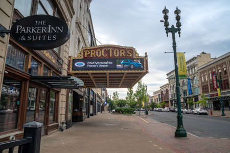 Schenectady, NY - USA - May 22, 2021: Proctor's Theatre is a former vaudeville house, designed by architect Thomas Lamb. The facade is faced in stucco, Doric pilasters, garlands and paterae.