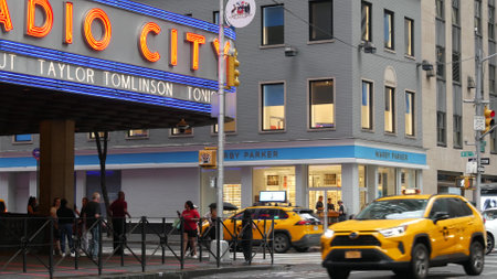 New York, United States - 10 Sept 2023: Manhattan Midtown street. Radio City Music Hall, Rockefeller Center, USA. People pedestrian, urban traffic, 6 Sixth Americas avenue crossroad, yellow taxi cab.