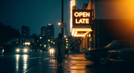 A photo of a building adorned with numerous bright lights illuminating the night sky, Art Deco style movie theater on a rainy evening, AI Generated