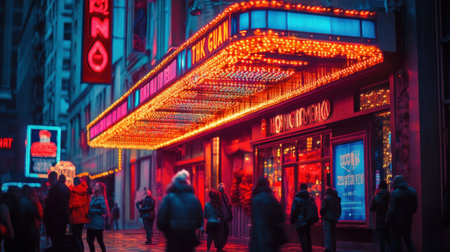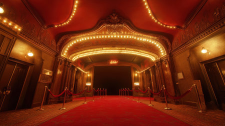 Discover the enchanting entrance of a vintage theater adorned with a luxurious red carpet and dazzling lights, inviting guests to an unforgettable experience.