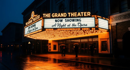 The glowing marquee of 'The Grand Theater' illuminates a wet street on a rainy evening. The sign advertises 'Now Showing A Night at the Opera,' while several people with umbrellas stand near the entrance, reflecting the classic, cinematic atmosphere.