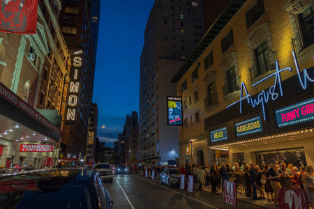 Evening view of people in line to see the famous musical at the August Wilson Theater on Broadway, Manhattan, New York. USA.