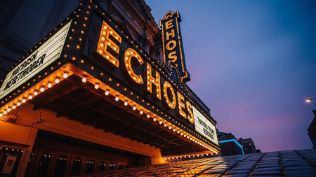 A movie theater marquee lit up at dusk with the word ECHOES on the sign
