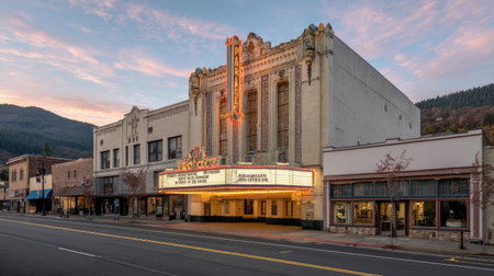 Exterior of historic theatre with marquee lit in golden hour light and entrance columns