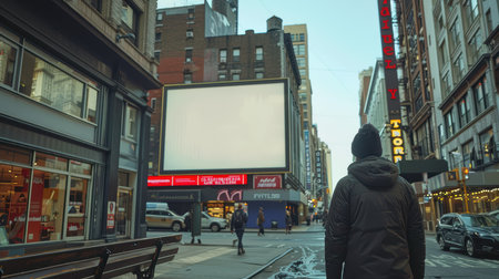A person stands on an urban street, gazing at a large blank billboard. The scene captures a contrasting city atmosphere, showcasing solitude against vibrant surroundings.