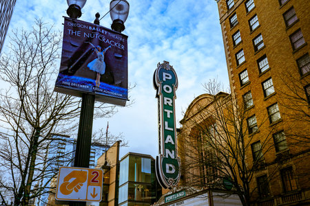 Portland, Oregon, United States - Dec 19, 2017: The iconic Portland sign of Arlene Schnitzer Concert Hall in downtown at winter season