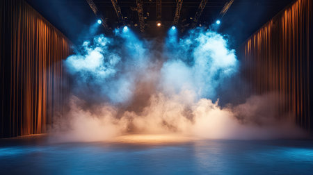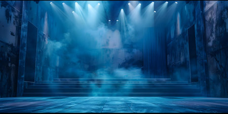 Captivating stage setup features blue lighting along with a smoky ambiance, perfect for theatrical performances and artistic productions. Ideal for event planning.