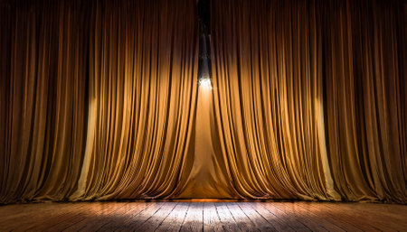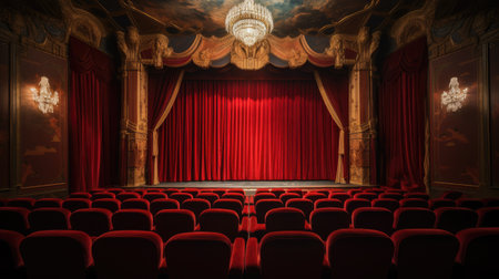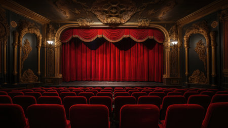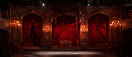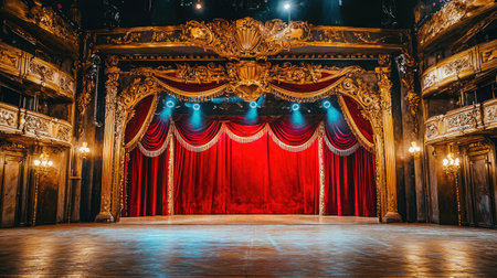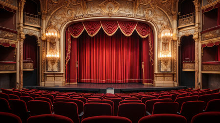 This image captures a classic theater stage featuring red curtains and ornate golden decor, perfect for showcasing performance and artistic expression.