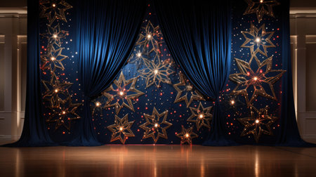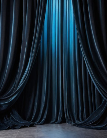 An exquisite theater stage featuring rich blue curtains and intricate gold embellishments, designed to create a dramatic and luxurious atmosphere for performances.