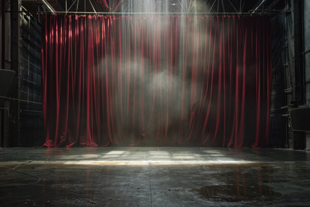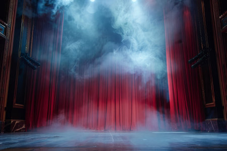 Immerse yourself in the captivating ambiance of a vintage theater stage Plush red velvet curtains adorn the proscenium arch, framing a mesmerizing cloud of atmospheric smoke A single spotlight illuminates the stage, revealing a worn wooden floor that evokes timeless grandeur Experience the allure of live performance in this unforgettable setting AI Generative
