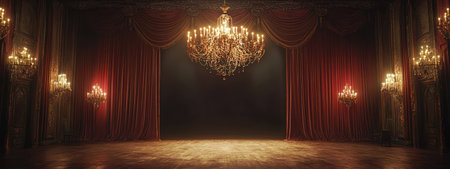 An ornate theater stage with red velvet curtains, grand chandelier, and elegant lighting creates dramatic ambiance