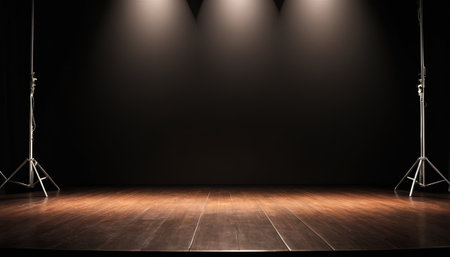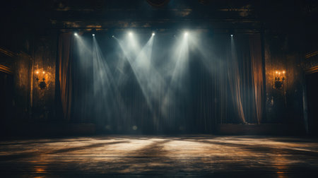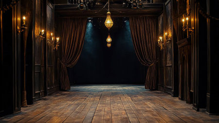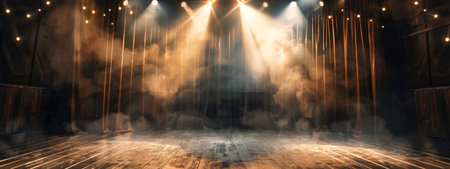 A dimly lit theater stage with wooden floors, dramatic spotlights, and a smoky atmosphere, creating a cinematic and moody scene.