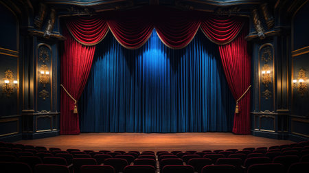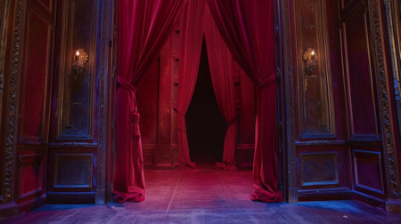 Luxurious red curtains frame the stage in a theater, ready for an evening of drama and performance.
