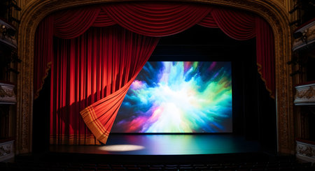 On a grand theater stage with ornate golden architecture, heavy red velvet curtains are pulled back to reveal a large screen displaying a vibrant, colorful cosmic explosion. A single spotlight hits the stage, creating a sense of dramatic revelation. This image blends classic entertainment with modern digital spectacle, symbolizing a grand opening, a major discovery, or the dawn of a new era.