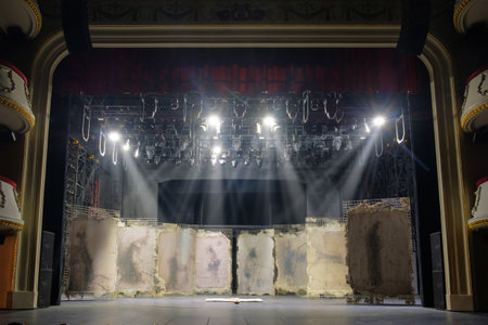 An empty stage awaits performers illuminated by dramatic lights setting the scene for an unforgettable theatrical experience.