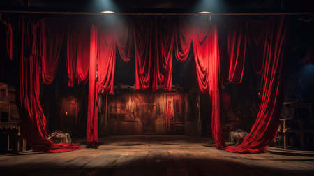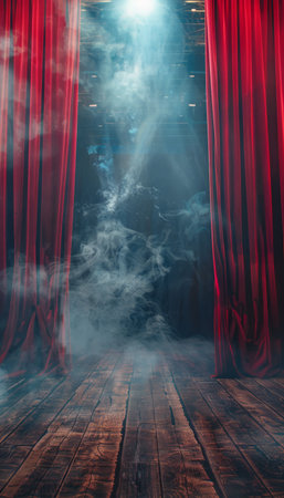 A dramatic stage setting with red curtains, wooden floor, and smoke Perfect for theatrical productions, presentations, or showcasing products Create a sense of mystery and anticipation AI Generative
