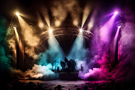 Theater setting with concert, stage lit by colored spotlights.Generative AI