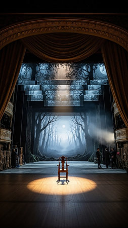 An empty theater stage draped with opulent red velvet curtains. A single stool sits in a pool of light from a spotlight, with a misty blue haze on the stage floor and a forest scene projected as a...