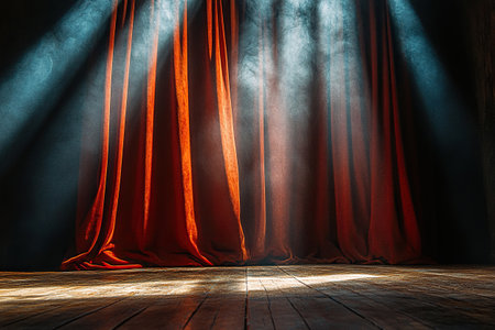 Wooden stage floor, red curtain and beams of light. Performance concept.