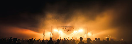 An evocative portrayal of concertgoers silhouetted in front of vibrant yellow stage lighting, embodying the electric atmosphere, dynamic energy, and visual artistry of a live music performance.