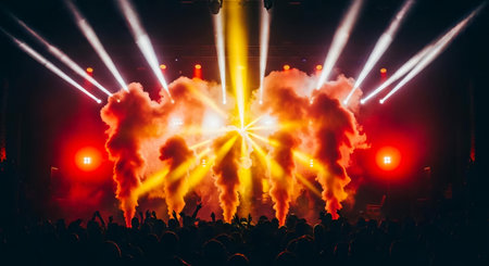 Vibrant concert stage with dramatic smoke and dynamic lighting effects