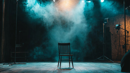 An empty wooden chair placed center stage under dramatic lighting with fog, creating a moody and mysterious atmosphere perfect for theater or performance themes.