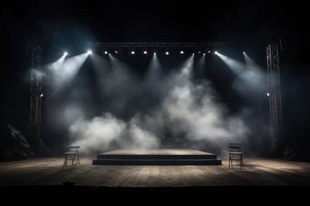Captivating stage scene featuring dramatic lighting with fog and smoke. Perfect for illustrating theatrical performances and creative productions.