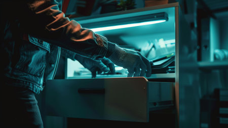 A thief wearing gloves rifling through a drawer in a dark office late at night