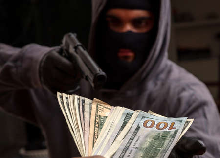 Armed robbery, thief with a pistol in gloved hand, Man in a balaclava threatens with a gun for stealing money, closeup view.