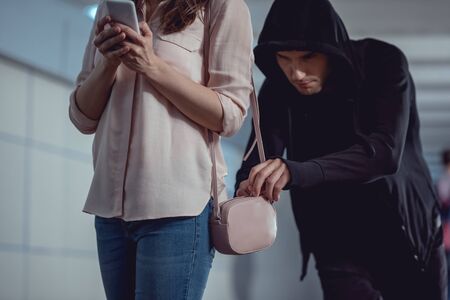 thief stealing money from bag of woman using smartphone