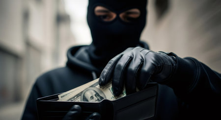 Thief in balaclava and gloves stealing money from a wallet. Criminal act of bank robbery or financial fraud concept.