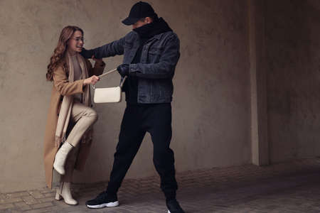 Woman fighting with thief while he trying to steal her bag in alley at night. Self defense concept