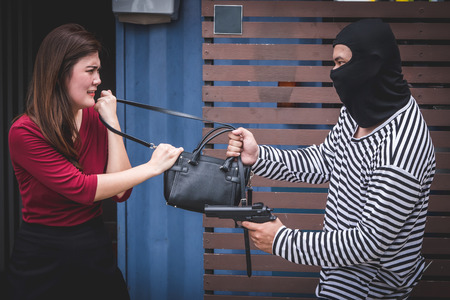 Thief threatening with gun, young woman fight over with robber who stealing bag.