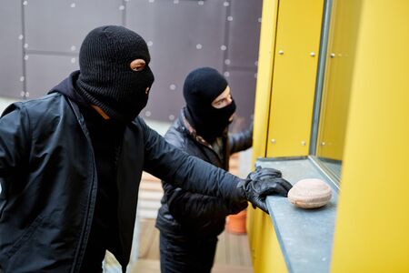 Suspenseful scene with a thief in a balaclava holding a crowbar, aiming to break through a glass window