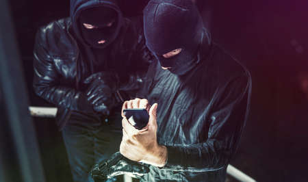 Dangerous burglars are standing in a dark hallway and wearing guns