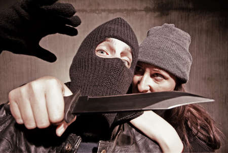 Thief with balaclava was spotted trying to steal in a apartment. Scared expression