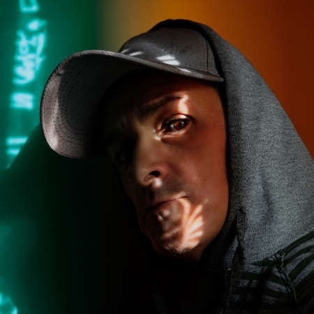 Stylish man in dark hoodie with black glasses and mask dark background, hacker, attacker and bandit