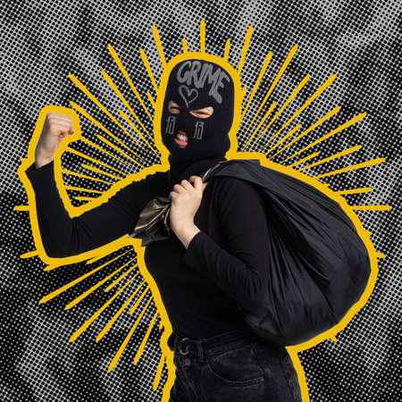 Contemporary art collage. Young woman in image of a thief wearing black balaclava and carrying big bag isolated over gray background