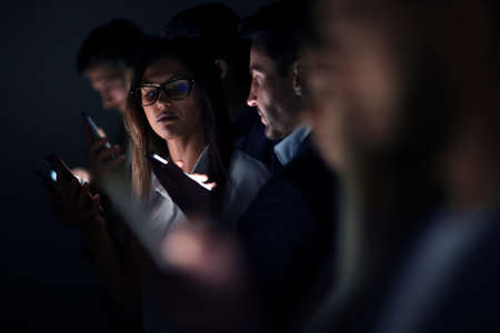 With smartphones in hands. Group of young people in casual clothes have a rest in the modern office.