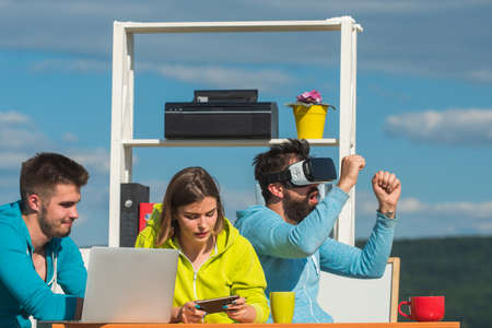 Business young people with virtual reality headset and digital gadgets outdoors office. Digital accessories on meeting. Developers meeting with virtual reality simulator in creative office.