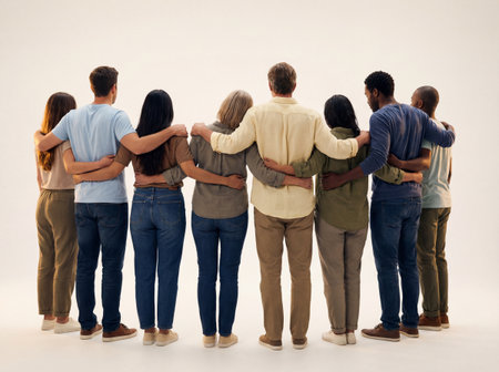 A group of people standing together, facing away, unity concept, on a light background. Generative AI
