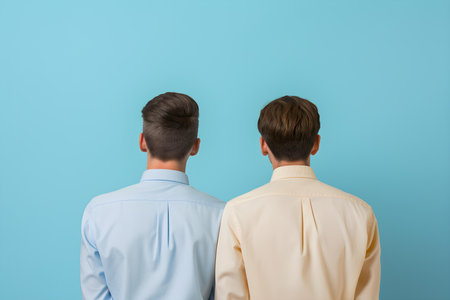 Portrait of a gay couple standing back to back on a blue background. Concept Portrait Photography, LGBT Pride, Back-to-Back Pose, Blue Background, Studio Photoshoot