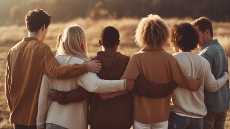 Generative AI : Back view of group of diverse people hugging each other Support help and youth community concept