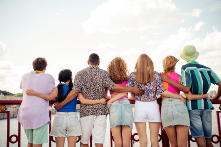 Diverse group of friends bonding and enjoying a sunny day outdoors in casual summer outfits